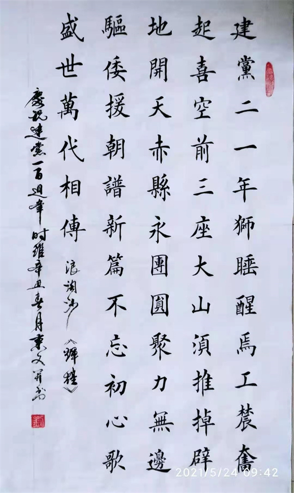 刘炳文书法作品欣赏 2021/06/03 次浏览 刘炳文 男 77岁 天津宝坻人。自幼酷爱书法,常年俯首砚田,寒暑不辍。书法初学颜、柳、欧,后临习二王诸家,兼收并蓄,凡与己相近者必多留意揣摩,汲取他人之长。书写亦注意线条的质感、节奏和墨色的变化。作品已形成温润流畅、藏露互用、方圆兼备、古朴典雅、洒脱飘逸的风格。 现天津市老年书画研究会宝坻分会会员;天津宝坻区书法家协会会员;中国榜书艺术研究会会员;中国老年书画研究会会员。 作品欣赏