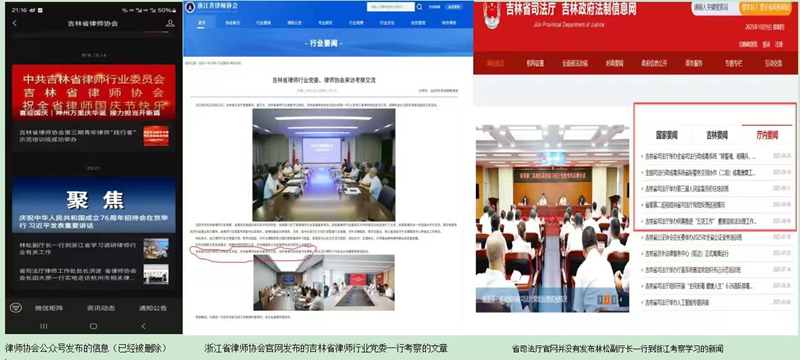在收到关于田大原涉嫌虚假诉讼等问题的投诉举报后,林松副厅长并未进行正面、实质性的回复,也未依法启动立案调查程序。即便是在互联网舆论持续发酵、风波不断的时期,林松副厅长仍然多次与田大原共同出席各类公开活动,例如:2025年7月25日其主持省律师行业党委会议,田大原参加;9月2日,共同出席吉林省律师行业党建工作培训班;9月6日,与田大原一同带队赴山东烟台调研律师党建工作等等。9月22日专程前往浙江“考察”。这明显可视为“故意展示双方关系正常、意在向外界传递“一切如常、举报无忧”的信号,从而缓解舆论压力。
