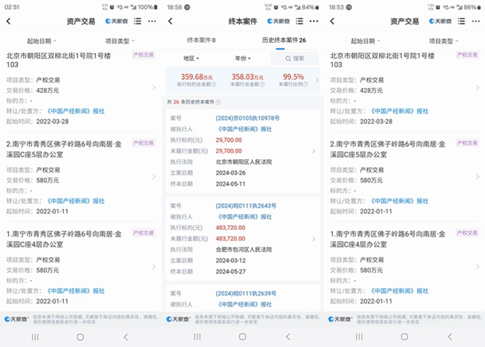 查询北京产权交易所交易系统可以看到这样的信息:产经报社位于北京市朝阳区双柳北街1号院1号楼103、104室两套房产,在2022年3月28日分别以428万元、428万元的价格协议出售给团中央所属机构——中国少年儿童新闻出版总社有限公司,共计856万元。