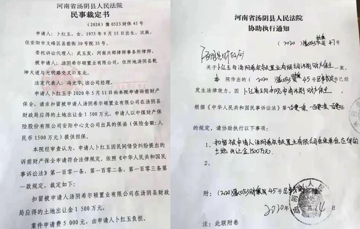2020年5月14日,河南省汤阴县人民法院作出“扣留汤阴希尔顿置业有限公司在汤阴县财政局应得的土地出让金1500万元”的(2020)豫0523财保45号民事裁定后, 向汤阴县财政局作出(2020)豫0523执保47号协助执行通知,协助执行扣留汤阴希尔顿置业有限公司应得的土地出让金1500万元。汤阴县财政局同日回复称,按通知书内容协助同意法院裁定。