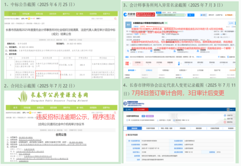 此外,根据《中华人民共和国政府采购法实施条例》第五十条规定,采购人应自合同签订之日起2个工作日内在省级以上财政部门指定媒体公告合同。而长春市民政局与这家会计师事务所于2025年7月8日签订合同,却直至7月22日才在长春市公共资源交易网予以公示,延迟长达14天,远超法定期限。针对这个问题,长春市民政局答复:我局与中标供应商签订合同后第一时间在长春市公共资源交易网按照法定流程进行合同公示,提交过程中,系统弹出错误提示,无法上传合同文本及相关附件。